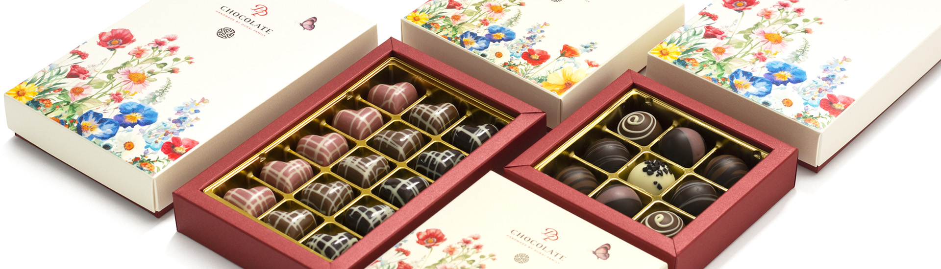 Darčekový box plný rozmanitých ručne vyrábaných praliniek tej najvyššej kvality. Možnosť výberu dominujúcej chuti – mliečna, horká, smotanová, oriešková alebo ovocná.